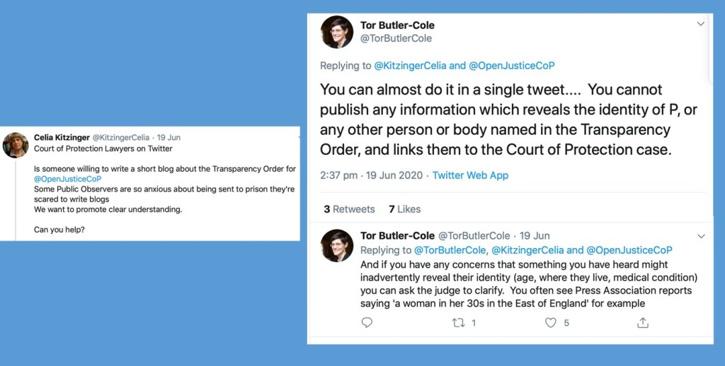 I started by trying to find a lawyer familiar with Court of Protection Transparency Orders to write a short blog on the topic. Here’s my request, on Twitter, and the response from Victoria Butler Cole QC