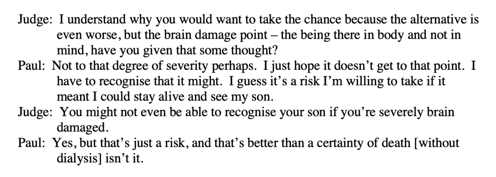 In response to the judge’s (Mr Justice Hayden’s) observation that “it must have been hugely distressing for everyone involved,” the doctor replied simply: “It was awful. Everyone on the ward was very distressed”. The judge asked, “If you hadn’t done that, what would have happened?” “I can’t remember what his potassium levels were,” the doctor said, “but if we hadn’t done that, he would have had a cardiac arrest. Without dialysis, Paul will die.” Not only does Paul refuse dialysis: on some occasions he even deliberately consumes high-potassium foods (bananas and coffee) with the intention of raising his potassium levels to cause death.