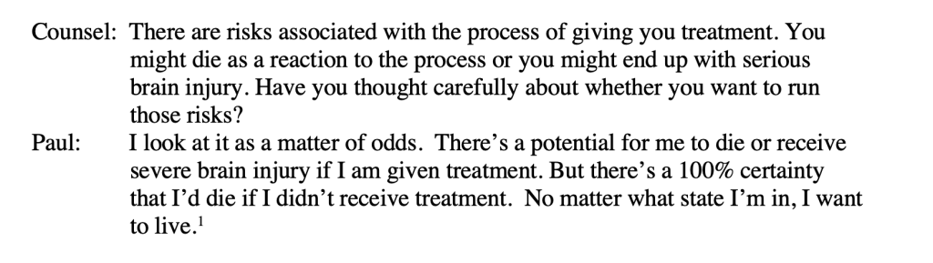 Having heard Paul’s views, and the arguments of his counsel, the position of the Trust remained that it was not in Paul’s best interests to undergo the high-risk procedures involved in treating him against his (non-capacitous) wishes.