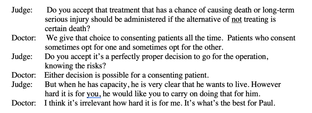 “I cannot think it is proper for me to sanction chemical and physical intervention between now and next Tuesday when the Trust tells me they no longer think it is in Paul’s best interests, and in circumstances where it is so injurious to his health that it might possibly kill him. So, I will have to resolve this if I can today”.