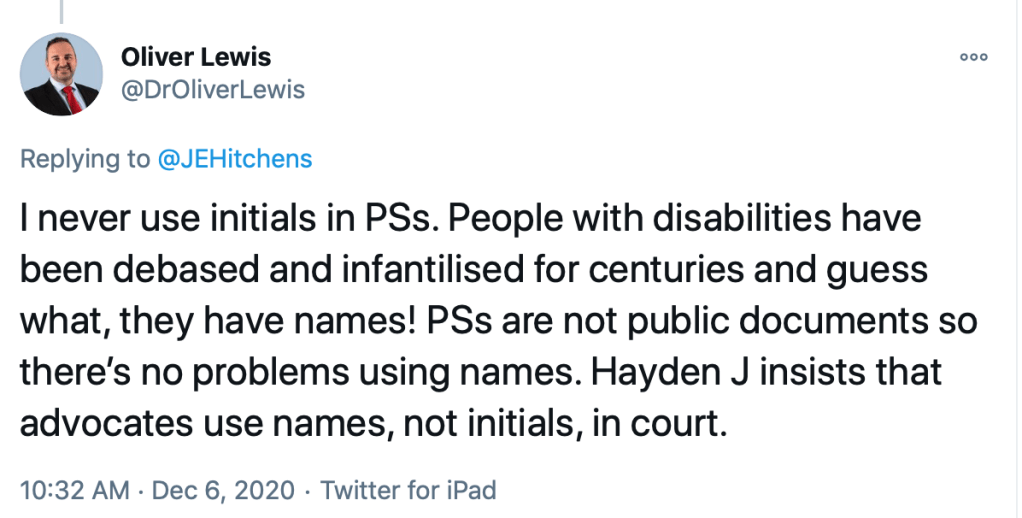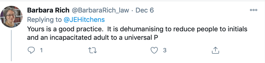 In my experience it is now relatively unusual for the lawyers and judge to do other than refer to the person by the name they – or, if they’re not able to participate, their family – prefer: sometimes a first name, sometimes a title and surname, sometimes a nickname or – for a trans person – a new chosen name (only his mother, giving evidence, repeatedly tripped up with name and pronouns).  My experience, like Oliver Lewis’s, is that Mr Justice Hayden normally insists on the use of real names:  just once when a person objected to the public use of her name, did he and the barristers refer to and address her throughout as “Ms P”, as was her preference.