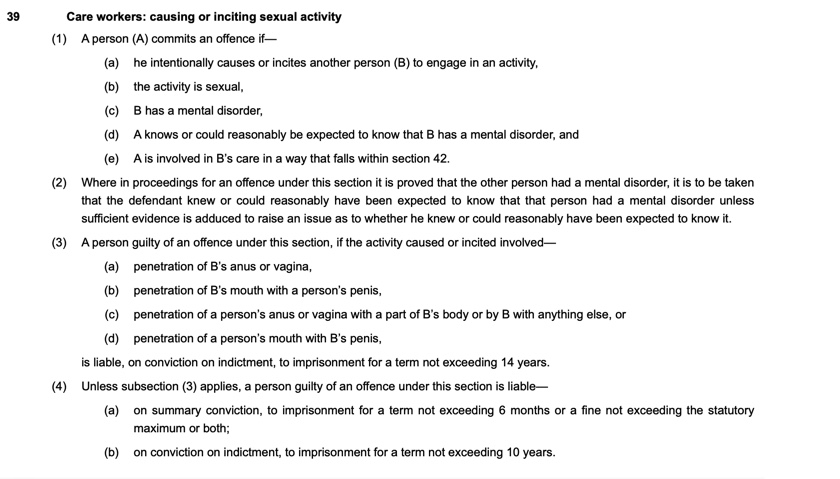 She also argued that the actions of the care workers would not “intentionally cause” C to have sex because C is making a voluntary and informed choice to engage in sexual relations, and simply requires the assistance of a third party to put this into practice. The ‘narrow’ interpretation of s.39 that would criminalise care workers assisting C in this scenario would also, she argued, criminalise acts such as driving a person with a ‘mental disorder’ from their home to their partner’s home (knowing that the couple were likely to have sex) and actions such as providing a private area in a care home for someone with a ‘mental disorder’ to have private time with their partner.
