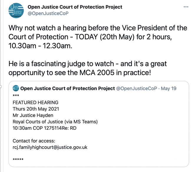 When I woke up this morning, the last thing I had on my mind was observing a Court of Protection hearing but as I logged into twitter to see my messages a post caught my eye: