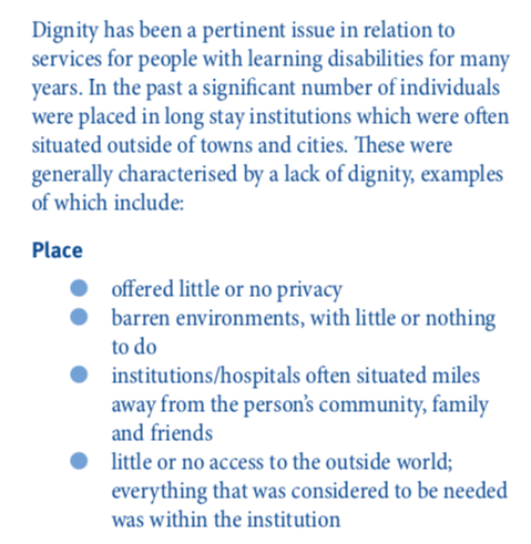 The 2009 Royal College of Nursing document, Dignity in Healthcare for People with Learning Disabilities, reads like this: