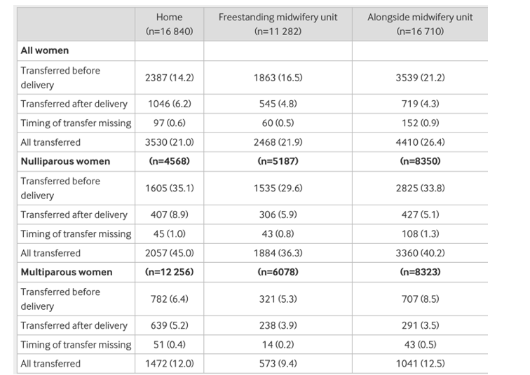 For transfers in labour or in the postnatal period, the study showed that 45% of primigravida are transferred: 35% before delivery and 8.9% after. For multiparous women the figures are 6.4% transferred before delivery and 5.2% after delivery. The figures were not much different for women giving birth in Freestanding Units or Alongside Midwifery Units, demonstrating the risk is not home birth per se but primigravida pregnancy. Many of the figures quoted by supporters of home birth do not differentiate between woman having their first baby at home and those having their second or more baby at home. That is why transfer figures are usually quoted as being a lot lower.
