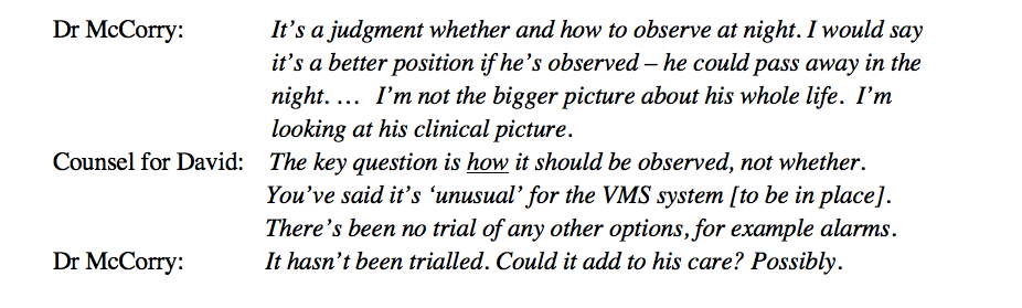 By the end of Dr McCorry’s evidence in chief, I thought he was suggesting that the permanent observation of David (including using the VMS) was a certain way of picking up all of his seizures. However, further questioning of Dr McCorry by David’s parent (as well as later evidence from David’s treating medical consultant) suggested otherwise. It became clear that VMS for people with epilepsy (including David’s kind of epilepsy) is quite unusual – his treating clinician later stated ‘5% of people I see’ have a VMS set up. It also wasn’t entirely clear why this had been implemented for David at the time it was. Furthermore, he hadn’t had any of the types of seizures of concern, at night, for over a year (which I think were the original justification for the use of the VMS).