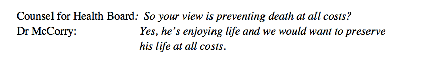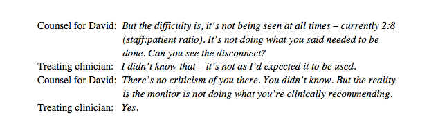 As counsel for David, Emma Sutton’s questioning was concise, incisive and absolutely to the point. She had clearly extracted the key pieces of information regarding the process of David’s care and was able to lead the court along a path that revealed a clearer view of the issues. Here’s an example: