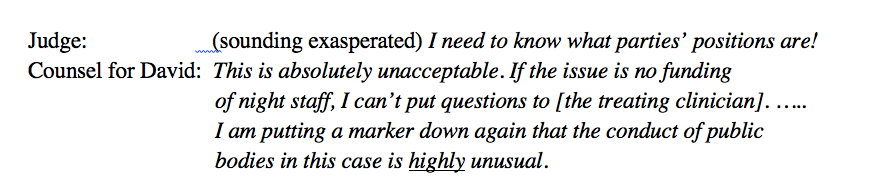 I have not heard a litigant in person question a witness before. I am not sure how common this is in the Court of Protection. It was a particularly affecting exchange because David’s treating clinician had seemingly had a good relationship with his parent over 15 years, and he clearly cared about David’s welfare. At the same time, it was evident that something had gone very awry with the planning and communication around David’s care.