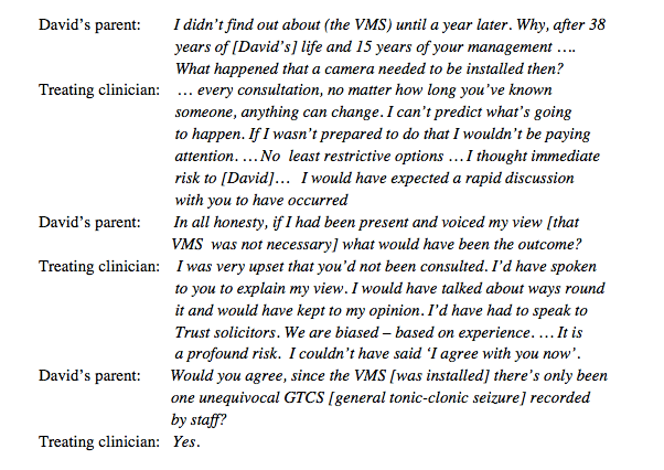 David’s parent had asked very probing, evidence-based, questions regarding risk and mitigation of risk, and applied them to David’s recorded seizures. The treating clinician seemed somewhat flummoxed by this and I felt unconvinced that he had properly considered whether the VMS would actually offer the protection to David that he proposed it would. David’s parent was of the view that it did not, and therefore the intrusion into his privacy was not justified.