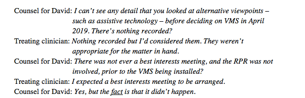 Leaving aside the unlawful installation of the VMS, the use of the monitoring device in practice felt very messy without a plan for evaluation of its effectiveness. I was also struck by the treating clinician’s response of ‘expecting’ a Best Interests meeting to be arranged – if he had expected it, and it hadn’t happened, why didn’t he rectify this situation (especially since it is a legal requirement)?