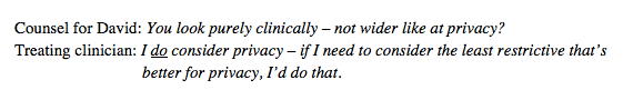 It was beginning to look as though no one whose responsibility it was to oversee David’s care (his treating clinician and the lead nurse who was tasked with drawing up an options appraisal) had entered into a deliberative process about methods to care for David, balanced with his human rights. I kept wondering: ‘what if a video-monitoring system IS, in the end, in David’s best interests and they just hadn’t done the working out’.