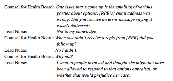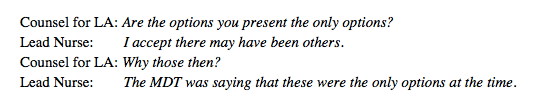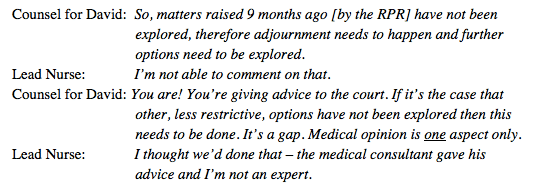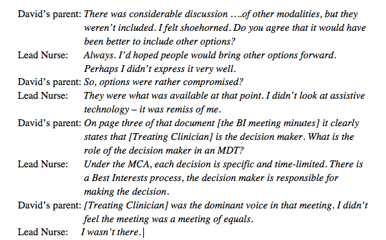 I was very surprised to hear the lead nurse’s reason for not ensuring that David’s RPR was part of the options appraisal for his care. What she would have needed to support that reasoning was an email back from the RPR stating that she was not allowed to respond to an options appraisal. This was not what happened.