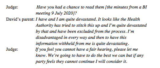 She then referred to minutes from a Best Interests meeting of 9 July 2020, chaired by a Mental Capacity Act practitioner from the Health Board. The judge asked if the minutes were in the bundle – they weren’t. Counsel for the Health Board stated that she did not know why they weren’t shared; they were an 8-page document. It was agreed that the court needed a twenty-minute break to read this document and the judge (addressing David’s parent) said: “Please say if you need more time to read these. Someone acting for themselves should have plenty of time. My tone says what I think about this.”
