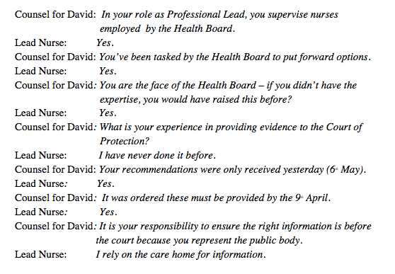 Counsel for the health board asked the witness to describe her role. The Lead Nurse explained that she oversees the nurses from the Health Board who look after David’s care. Her role in the CoP hearing was to bring together a full options appraisal (for the monitoring of David’s epilepsy) for the court to consider. A curious exchange occurred at the start: