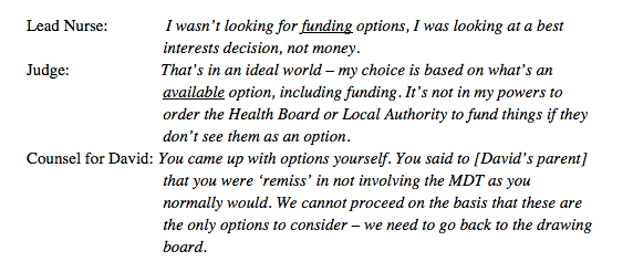 The judge addressed David’s parent: “The Health Board and the Local Authority are at cross-purposes in terms of funding an additional person – whether this is for [David] or to share with others. Are you prepared to continue?“ David’s parent replied ‘Yes’.