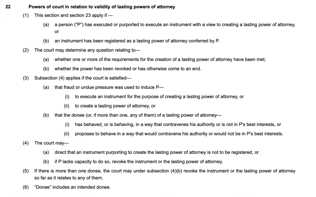 The question of revocation, one of the key issues of this case, came following concerns by the Office of the Public Guardian. The legal test for decision making about revocation of an attorney and subsequent appointment of a professional deputy is the best interests test (s. 22(3)(b) Mental Capacity Act 2005).