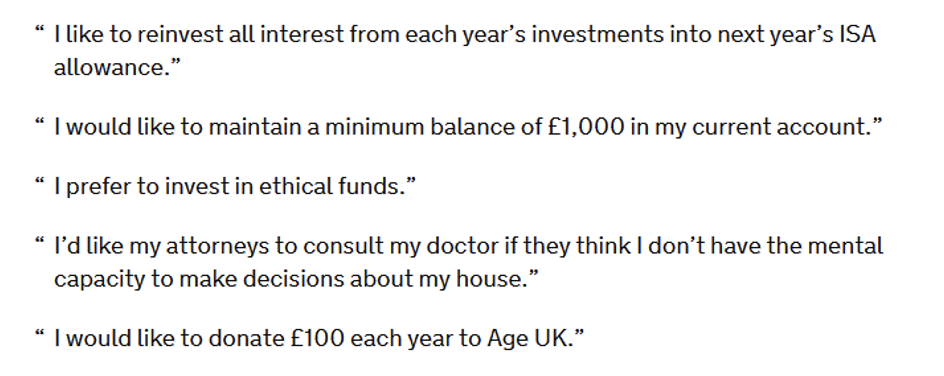 In drafting preferences, the donor has an opportunity to articulate what they would like their attorneys to consider when making decisions; the attorney is not bound to follow them but should consider in decision making. Wording like “I would like…” and “I would prefer…” should be used in this section. Examples of preferences in the OPG Guide to making an LPA include: