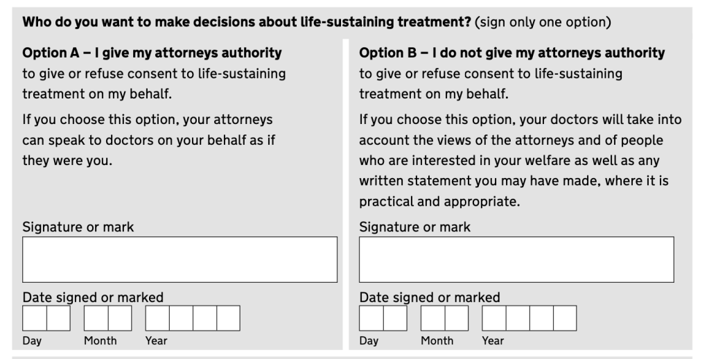Mrs W had nominated one of her sons and one of her daughters as attorneys for a Health and Welfare Lasting Power of Attorney. She selected Option A in the Lasting Power of Attorney application. This meant that Mrs W gave her son and daughter authority to give or refuse consent to life sustaining treatment.