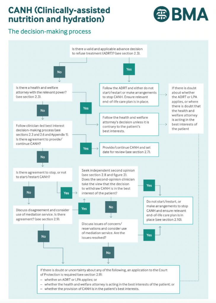 The law is clear on withdrawal of clinically assisted nutrition or hydration (CANH) following the Supreme Court case of An NHS Trust v Y and another [2018] UKSC 46 and the subsequent publication of national Guidelinesby the British Medical Association and the Royal College of Physicians, endorsed by the General Medical Counsel.