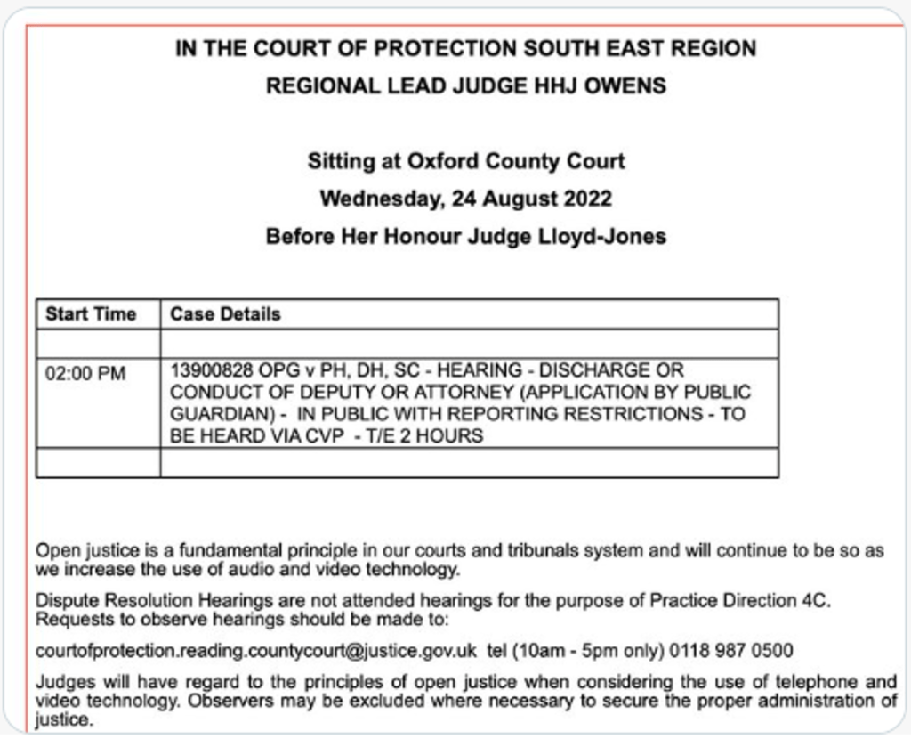 The Open Justice Court of Protection Project tweeted about this hearing (COP 13900828, before HHJ Lloyd-Jones on 24th August 2022), and reproduced the listing from CourtServe. It was listed as being about “Discharge or conduct of deputy or attorney” and the application was by the Public Guardian.