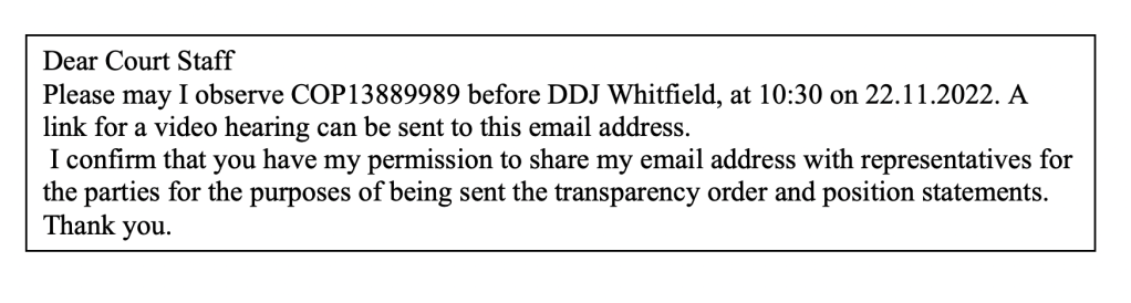 Using wording from a previous template I applied via email; I am including the email which can be used and adapted for anyone wishing to attend a hearing. It’s important to put the words “Observer Request” and the case number and judge’s name in the subject header of the email. This is because staff are busy and it’s helpful to make it as clear as possible what you are asking for.