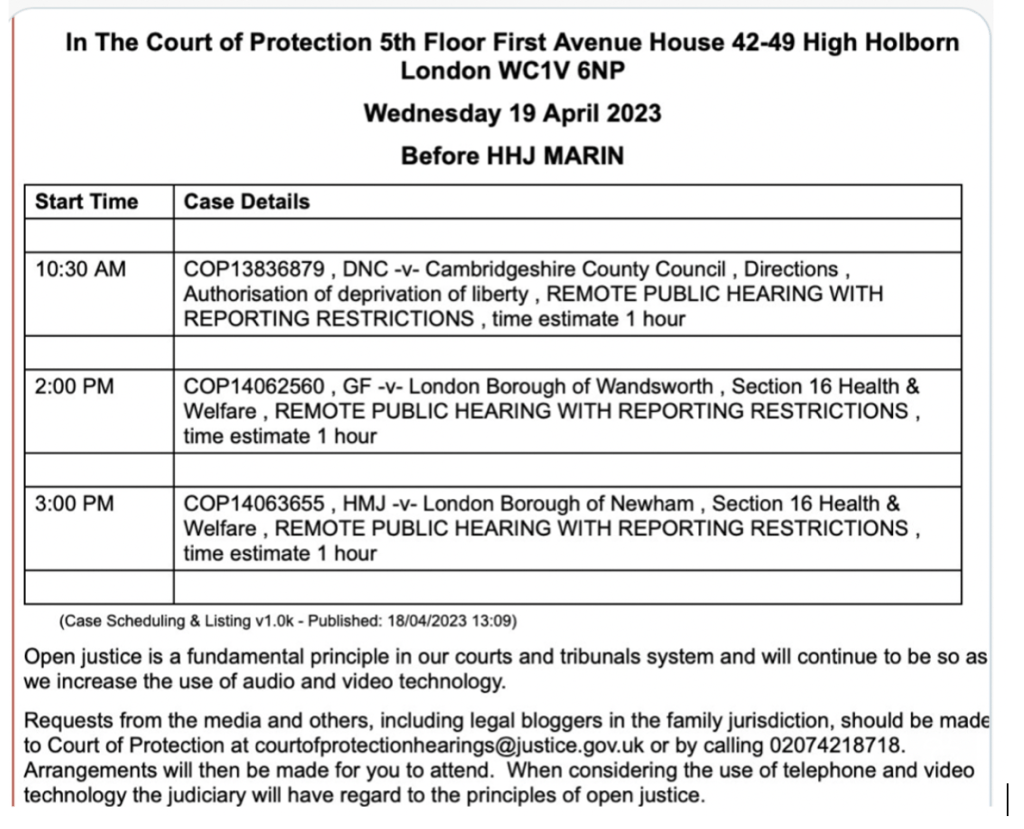 I had asked to observe two hearings before HHJ Marin on the afternoon of Wednesday 19th April 2023, one at 2pm and one at 3pm, both listed as public hearings and both dealing with “Section 16 Health and Welfare”. This refers to the section of the Mental Capacity Act that says the court has the power to make decisions if a person lacks capacity in relation to either their personal welfare or their property and affairs.
