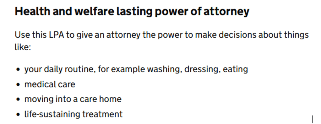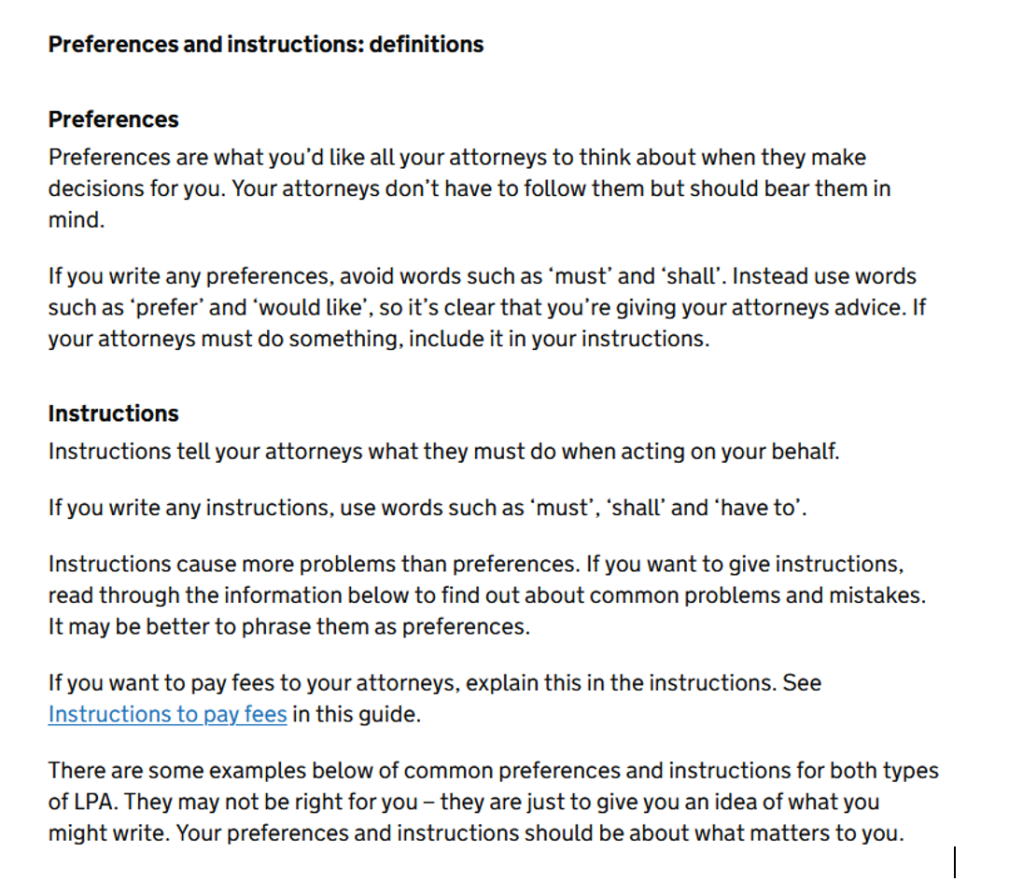 The example is from an existing Lasting Power of Attorney and one where nothing specific has been documented.