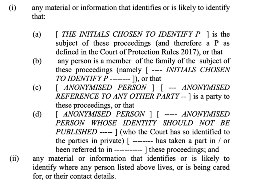 There is a standard template for Transparency Orders in the Court of Protection and §6 covers the “subject matter of the injunction” i.e. the things that cannot be publicly reported. The main restriction relates to the identity of P (the person at the centre of the case) and their family. Paragraph 6 of the template forbids us from revealing: