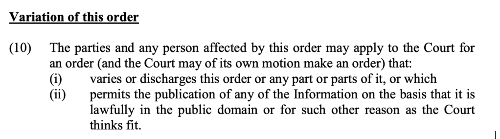 The variation I am asking for relates to §6 “The subject matter of the injunction” which provides a list of information covered by the reporting restriction.