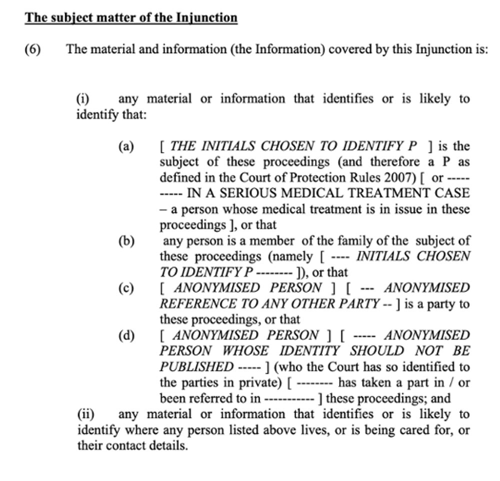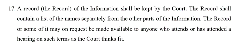 16. The most salient paragraph of the ‘Standard Order’ for public observers is the list of “material and information (the Information)” covered by the Injunction. As observers, we understand that we are “persons bound by the injunction” (#5) and what it prevents us from doing (#7), and the matter of duration (§8) is rarely at issue. It is to #6 (or its equivalent in any actual TO) that we turn to check what we are or are not allowed to report.