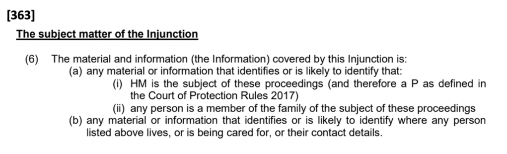 On discovering that no TO had been prepared, the judge said: “you’re welcome to observe but the identity of the parties to the proceedings must remain confidential”. She checked with the advocates whether they were content to go ahead on that basis. Francis Hoar (counsel) provided a slightly different version of the TO: “You cannot report anything that may risk identifying any of their parties, or where they live, or who they associate with”. (The addition of “who they associate with” was new to me.) The judge asked the observers if we understood, so I was at that point able to ask whether we could identify public bodies, since they were also ‘parties’ to the proceedings. The judge said: “Yes, I meant the family. Not the public bodies. I think I need a pro-forma I can read out in these situations”. When I eventually received the TO, it prohibited identification of the CCG. I am unclear whether or not what the judge said in court means that she varied the pre-existing TO (made by HHJ Owens on 23rd April 2021). I’m not sure she meant to. [364]