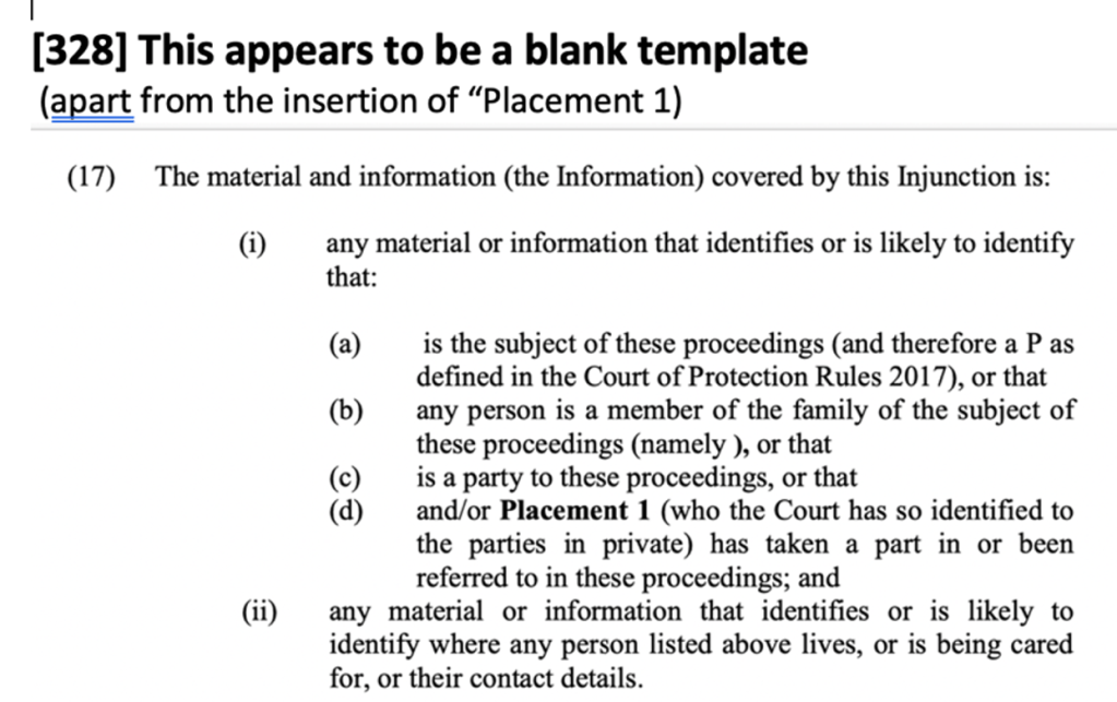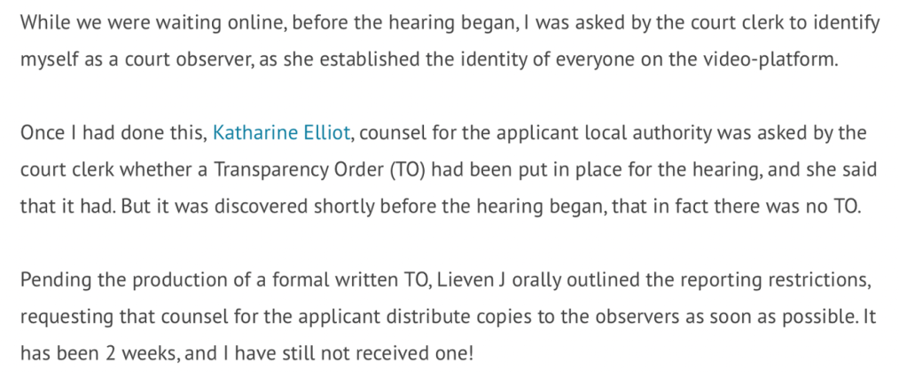 26. The TO from which the first of the extracts above is taken [328] was sent by court staff in advance of the hearing, attached to an email in which the judge was quoted as having said, “requestor is welcome to attend subject ONLY to confirmation that she has received copy of TPO”. I confirmed receipt at the beginning of the hearing – but that didn’t seem the right time to raise the deficiencies of the order I’d been sent. It seems unlikely that the judge can actually have read it. (Another member of the public, Bridget Penhale, Co-editor Journal of Adult Protection, and an elder abuse and adult safeguarding specialist, tells me she also has received a blank template TO for a different hearing.)