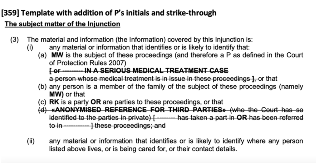 27. The same inattention to detail in TOs extends beyond the paragraph concerned with “The subject matter of the Injunction” and is sometimes apparent across the whole document. For example, one TO gives P’s initials as MH and those initials [MH] are used sometimes in the TO, including in the “subject matter of the Injunction” section, but there are also places where they should have been entered and have not and it instead reads “[the initials chosen to identify P]” [355]. Another TO uses “P” rather than “LD” (the nominated initials) for the person at the centre of this case and there are omissions throughout, e.g. “1) This application be set down for an attended hearing on [missing date] at [missing time] with a time estimate of [missing time estimate] at which the Court will consider the following issues:…”. (3) The attended hearing is to be listed as follows: [but nothing follows) [357]