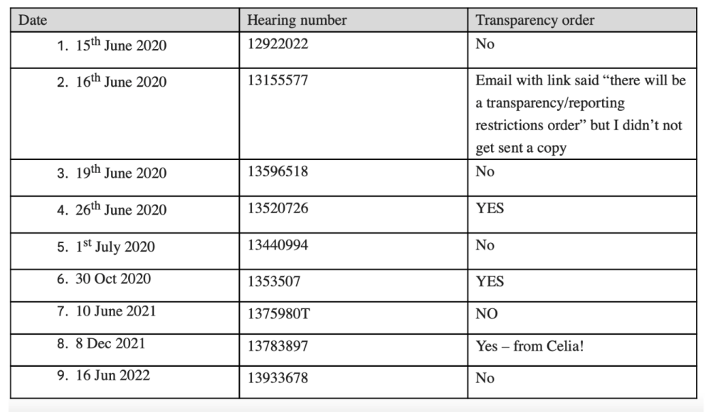 Introduction: On 21st October 2022, I submitted (at the request of counsel and with the permission of the court) a witness statement to Mrs Justice Lieven, concerning Case no. COP 13180943). I was asked to supply evidence as to how, according to my observations, Transparency Orders are actually working in practice. This came in the wake of Mr Justice Mostyn’s expressed concerns about Transparency Orders in Re EM [2022] EWCOP 31. I’ve reproduced the bulk of that evidence below because I want it be publicly accessible now that I’ve also recently (a) sent it to the ad hoc working group of the Court of Protection Rules Committee working on on Transparency Orders and (b) referred to it in my evidence to the Ministry of Justice on “Open Justice – the Way Forward”. It starts with §6 because I’ve left the numbering as per the witness statement as submitted (and omitted the first 5 paragraphs about me, setting out my personal academic background and experience). The statement is substantially based on an analysis of Transparency Orders at what were then the most recent 50 hearings I’d observed. I have no evidence of any significant change since then. I look forward to developments following the Rules Committee work on how to do transparency better. [Celia Kitzinger]