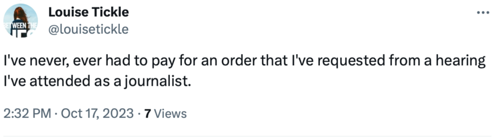 But I also asked journalists whether they had to pay for Orders and discovered they did not. Press Association journalist Brian Farmer told me that although the press does sometimes have to pay for some documents, Orders from public hearings are not amongst them. Freelance journalist Louise Tickle tweeted publicly: