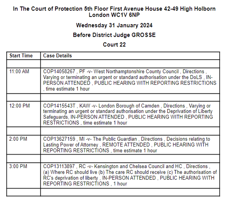 The hearing I observed – with the support of Daniel Clark from the Open Justice Court of Protection Project core team – was held on 31st January, at 2:00p.m before District Judge Grosse. It was listed as concerning a Lasting Power of Attorney (LPA) – see the third case on the list below, taken from Courtel/CourtServe (COP 13627159).