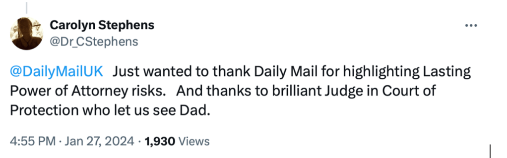 She’s pleased with the way journalists have handled her story. As she said on X/Twitter “Just wanted to thank Daily Mail for highlighting Lasting Power of Attorney risks. And thanks to brilliant Judge in Court of Protection who let us see Dad.” (Carolyn)