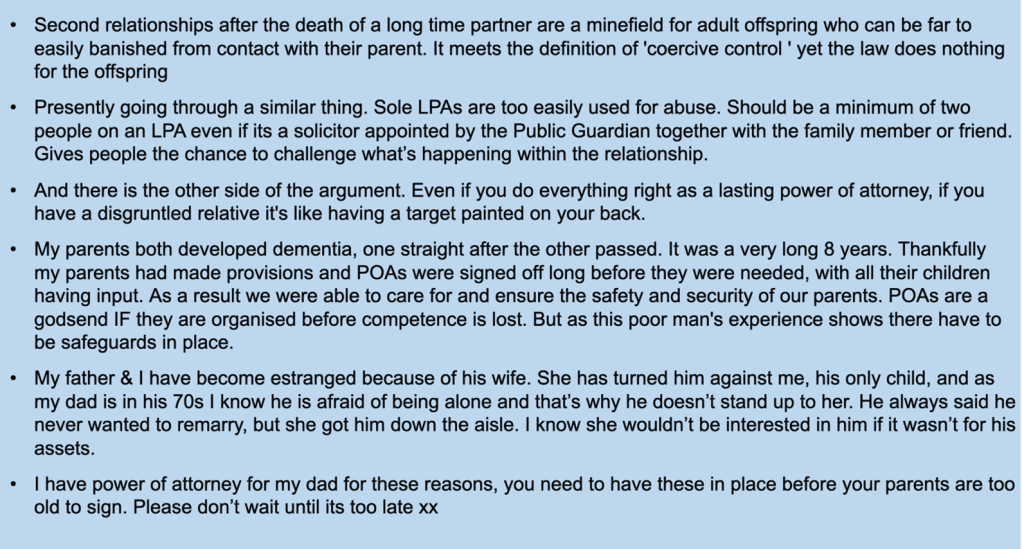 There was a deluge of response to the Daily Mail story from people who said they had similar experience, referring to “coercive control”, “grooming” and “predatory marriage” as well as abuse of Lasting Power of Attorney: others emphasised the value of LPA in protecting their loved ones.