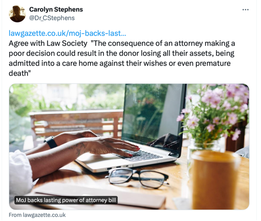 Carolyn is especially concerned that new proposals to modernise the process of applying for LPAs could lead to further abuse, with less checking of the vulnerable person’s capacity to make the LPA. She’s tweeted: “Agree with Law Society “The consequence of an attorney making a poor decision could result in the donor losing all their assets, being admitted into a care home against their wishes or even premature death“.