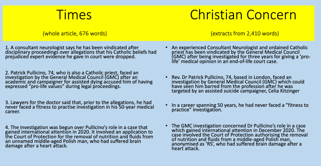 Other media outlets – unlike The Times – did seek out my views in advance of publication and published my rebuttal of Dr Pullicino’s claims as part of their reports. The ‘far right’ Epoch Times published a piece (here – requires registration to view) based on the Christian Concern press release, but accurately incorporating my perspective. There’s a fair and accurate report on the Catholic conservative advocacy website LifeSiteNews: it’s clearly oriented for a Catholic readership whose sympathies will naturally be with Dr Pullicino rather than with me, but it’s well-written, acknowledges – as The Times does not – my academic expertise in the medical condition Dr Pullicino was giving evidence about, and gives adequate space to representing my views. It’s based on original journalism and independent research.