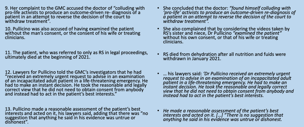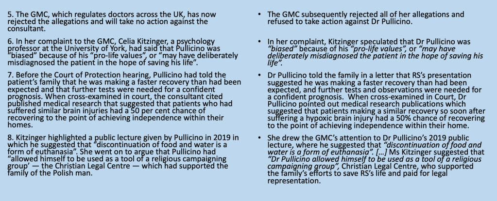 Like Christian Concern, The Times reports that Dr Pullicino and the Christian Legal Centre “supported the family of the Polish man” (see Appendix A §8). The piece omits to mention (presumably because the Christian Concern press release doesn’t either, so The Times didn’t know this) that there was a division within the family, who disagreed as to what the patient would want. Although the ‘birth family’ wanted treatment to continue, the man’s wife did not. So Dr Pullicino and the Christian Legal Centre were most certainly not supporting her.