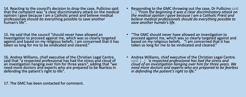 Here are two examples – both of which follow the same formula as is used in the story about the “vindication” of Dr Pullicino. Each article contains only information from the Christian Concern press release and nothing more. Each reorders and paraphrases that press release and adds a closing sentence which gestures towards an unarticulated ‘alternative’ perspective which never materialises.