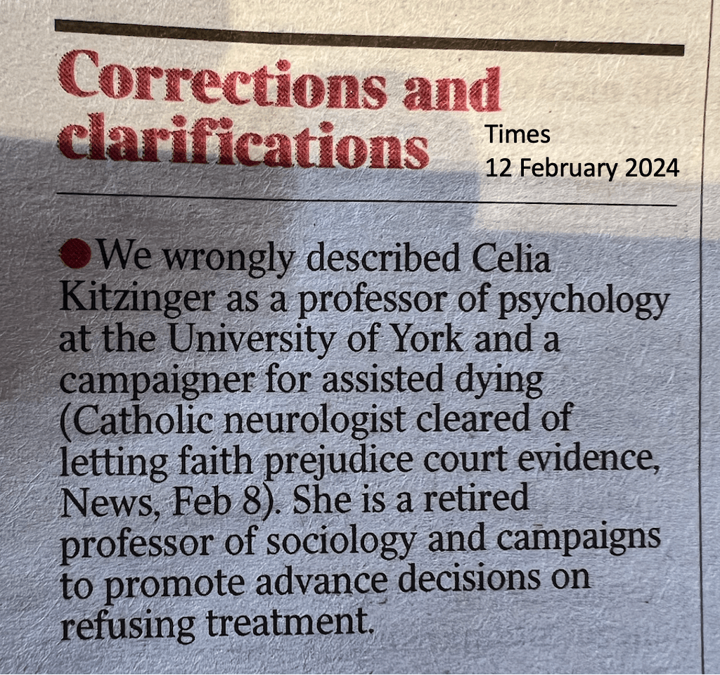 Consequently, the article as originally published had obvious factual errors, which could have been easily discovered with a simple google search. I am neither a professor of psychology at York, nor a campaigner for assisted dying, as The Times originally claimed. A “correction” was published in the print version (The Times, 12 February 2024, see Appendix B) and the online version has now been edited to correct this misinformation.