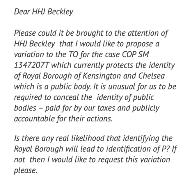 At the start of the hearing, HHJ Beckley said that this issue had been “helpfully raised” and that “… the TO unusually, and in my view erroneously, says RBKC shouldn’t be identified. There’s no reason that RBKC shouldn’t be identified. That will be taken out of the order“.