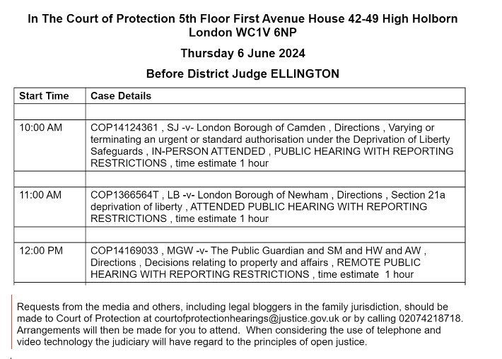 My interest in observing COP cases is limited to cases involving attorneys and deputies, and these are usually about property and financial affairs. There are few of them to observe and they are increasingly listed as being ‘in person’, which makes it hard for me to attend. I was therefore grateful to Celia when she alerted me to a hearing before DJ Ellington at 12.00pm on Thursday 6th June 2024 which was listed (as shown below) as a hearing concerning “decisions relating to property and affairs” with “The Public Guardian” as first respondent.