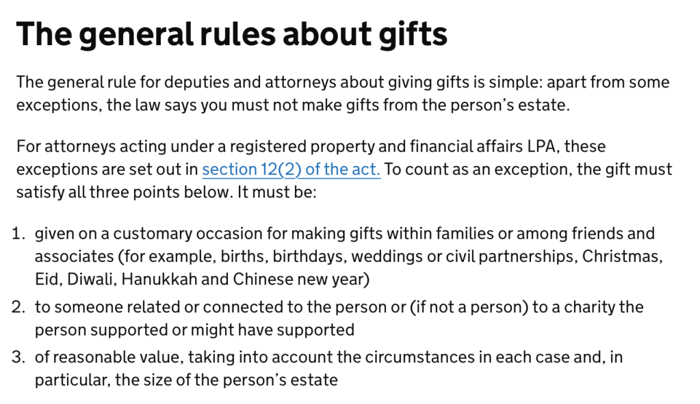The rules about gifts are set out in Public Guardian Practice Note PN7 (giving gifts).
