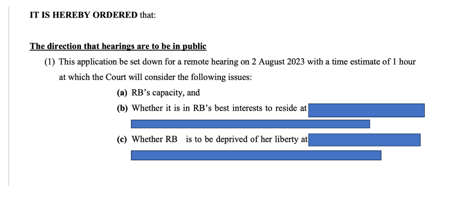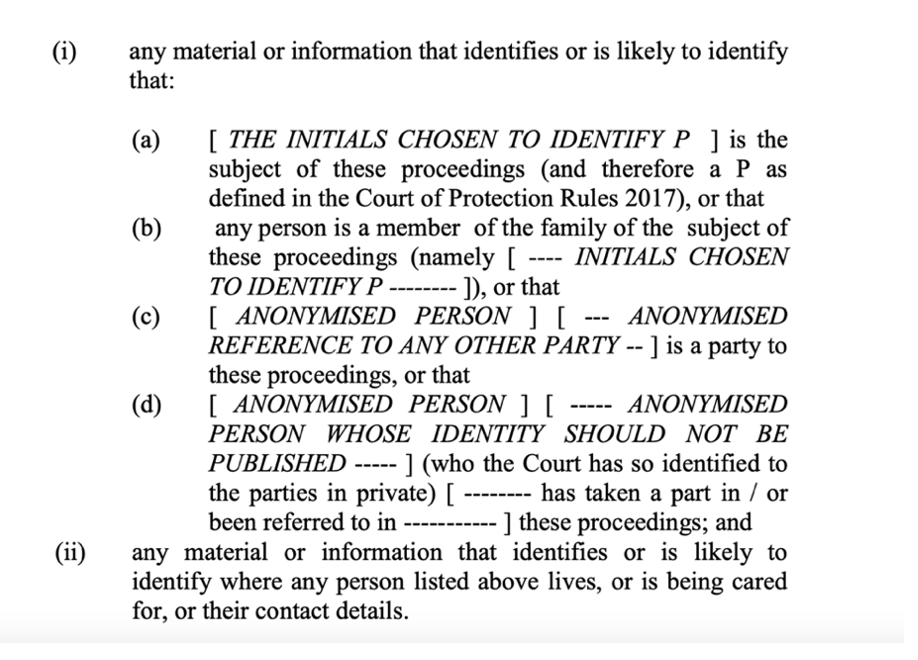 In 2017, Mr Justice Charles (the then Vice President of the Court of Protection) published a note about the Transparency Pilot (triggered by a judgment he’d just handed down). He updated the standard TO and it’s clear that TOs should be in an anonymised form.