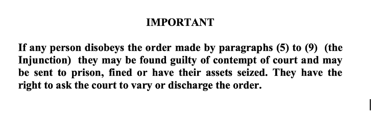 If anybody breaches this injunction, they could face “committal hearings”: the judge could them to prison. This does sometimes happen and OJCOPP blogs have covered this type of hearing. Here are two examples: