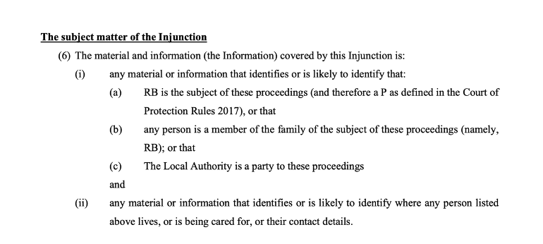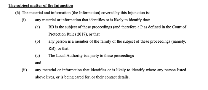 Paragraph 6 defines the “Information” that the injunction is about. That information is the identity of the person at the centre of the case ((6)(i)(a)) and her family members ((6)(i)(b) and the LA, and any information about where they live. Then paragraph 7 of the transparency order, says that the information listed in §6 “cannot be published or communicated by any means orally or in writing, electronically, and persons bounds cannot cause, enable, assist or encourage the publication or communication of it or any part of it”.