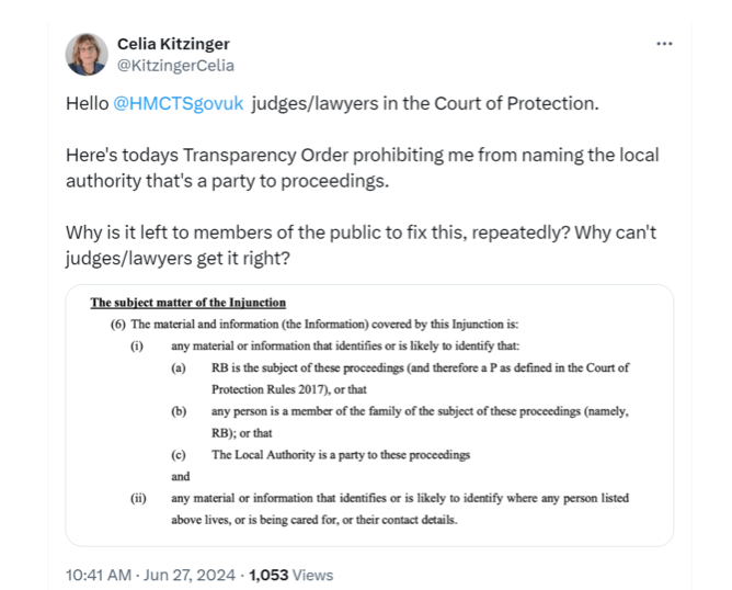 Once again it was Celia Kitzinger who identified the problem, alerted the judge to it, and asked for the order to be amended. The transparency order dates from July 2023 – so that’s nearly a full year that anyone who has been issued with the transparency order has been provided with a printed or electronic document with full details about where P lives.